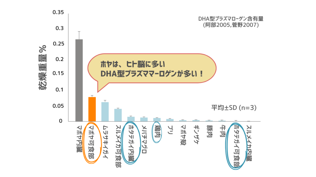プラズマローゲンは、鶏もも肉やホタテ、ホヤなどに含まれており、そのうち、人の神経組織に多いDHA型プラズマローゲンがホヤには豊富に含まれています。
