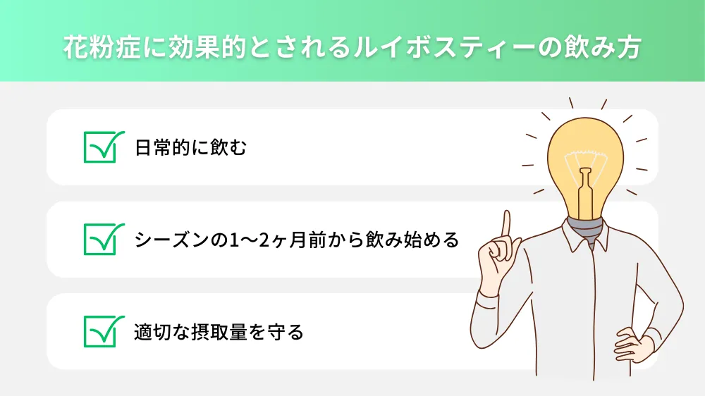 次に、花粉症に効果的とされるルイボスティーの飲み方を、以下の3つに分けてご紹介します。