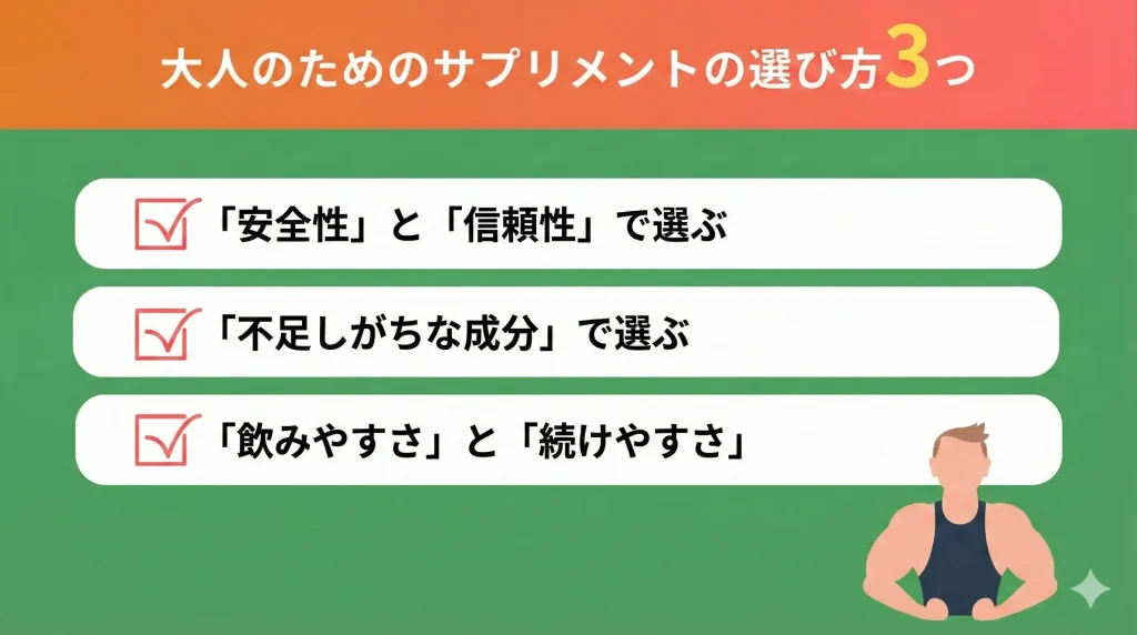 市場には多くの商品が出回っていますが、健達ねっと世代が選ぶ際に重視すべきポイントは以下の3点です。
