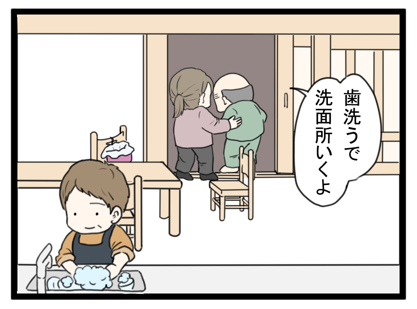 夕飯を終えたら歯磨きをするためにじーちゃんと洗面所に行きます。このとき母は食べた後の片付けや洗い物をしているので、わたしはその間に歯磨きをさせたり入れ歯の洗浄をしたりします。それぞれが関わることがないので、お互い干渉せずイライラすることも減ったように感じます。