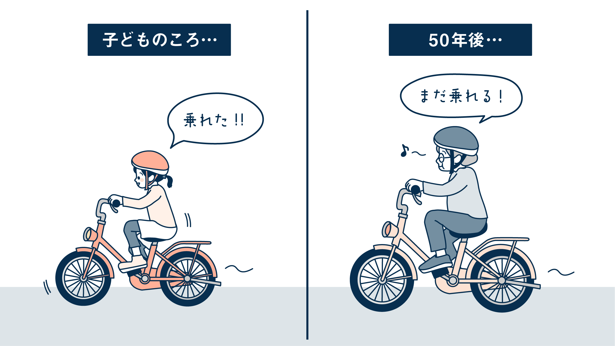 自転車の乗り方や楽器の演奏などは手続き記憶といって体で覚えた記憶です。自転車に乗れるようになると、その後何年も乗る機会がなかったとしても、いざ乗ろうとすればまず間違いなく乗れます。それくらい体で覚えた記憶は失いにくいという特徴があります。