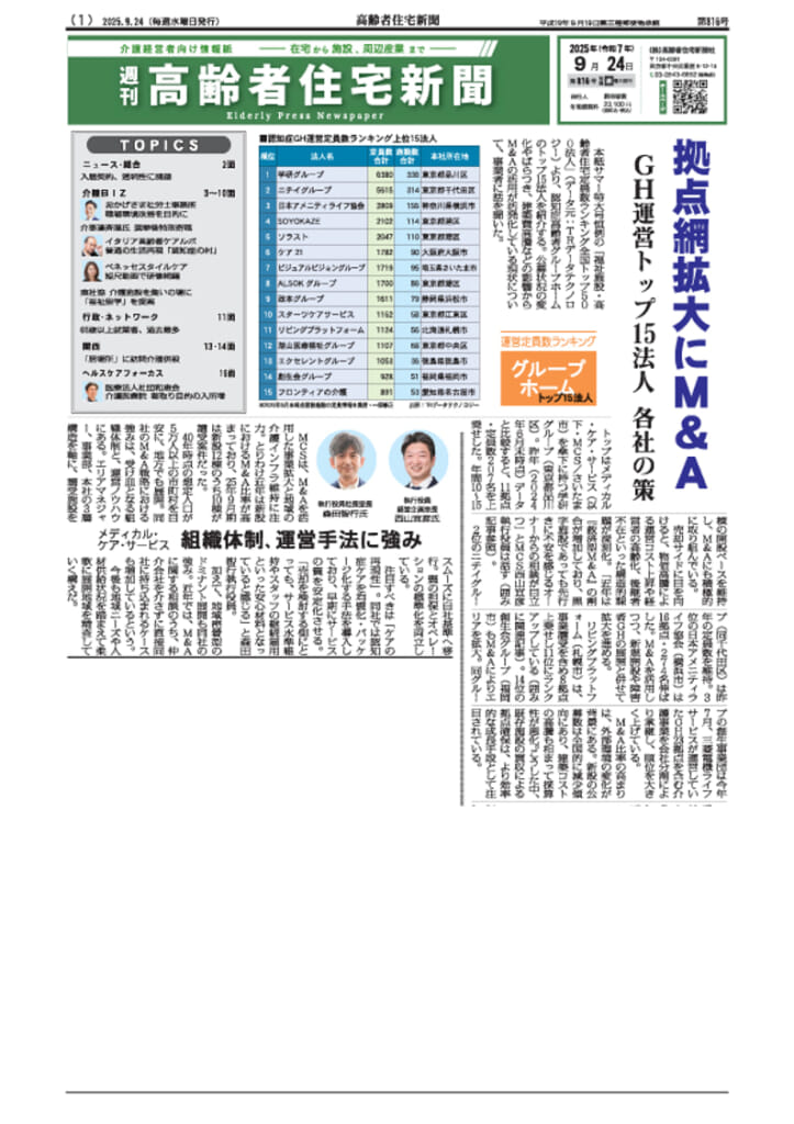 高齢者住宅新聞 2025年9月24日(水)発行 1面拠点網拡大にM&A GH運営トップ15法人
