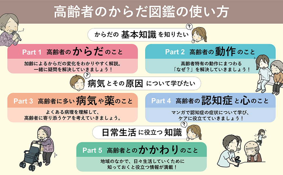 現役理学療法士が加齢による高齢者のからだの変化や病気、こころのケアについてイラストでわかりやすく解説しています。