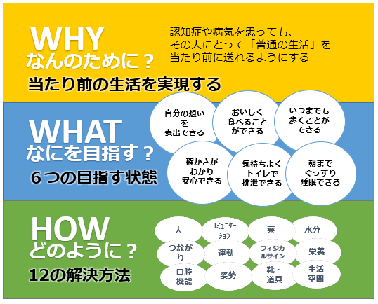 生活課題に直結する要素を「6つの目指す状態」として設定。おいしく味わえる食事状態やトイレでの排せつ、自分の足でしっかりと歩ける歩行状態、快適な睡眠など身体面での状態改善や、自分の望み・想いを表出できる状態をつくること、また、認知症の方の「不確かさ」で「不安」な状況を「確か」で「安心」できる状況にすることなど、この6つが整うことで「当たり前の生活を実現する」ことにつながると考えています。