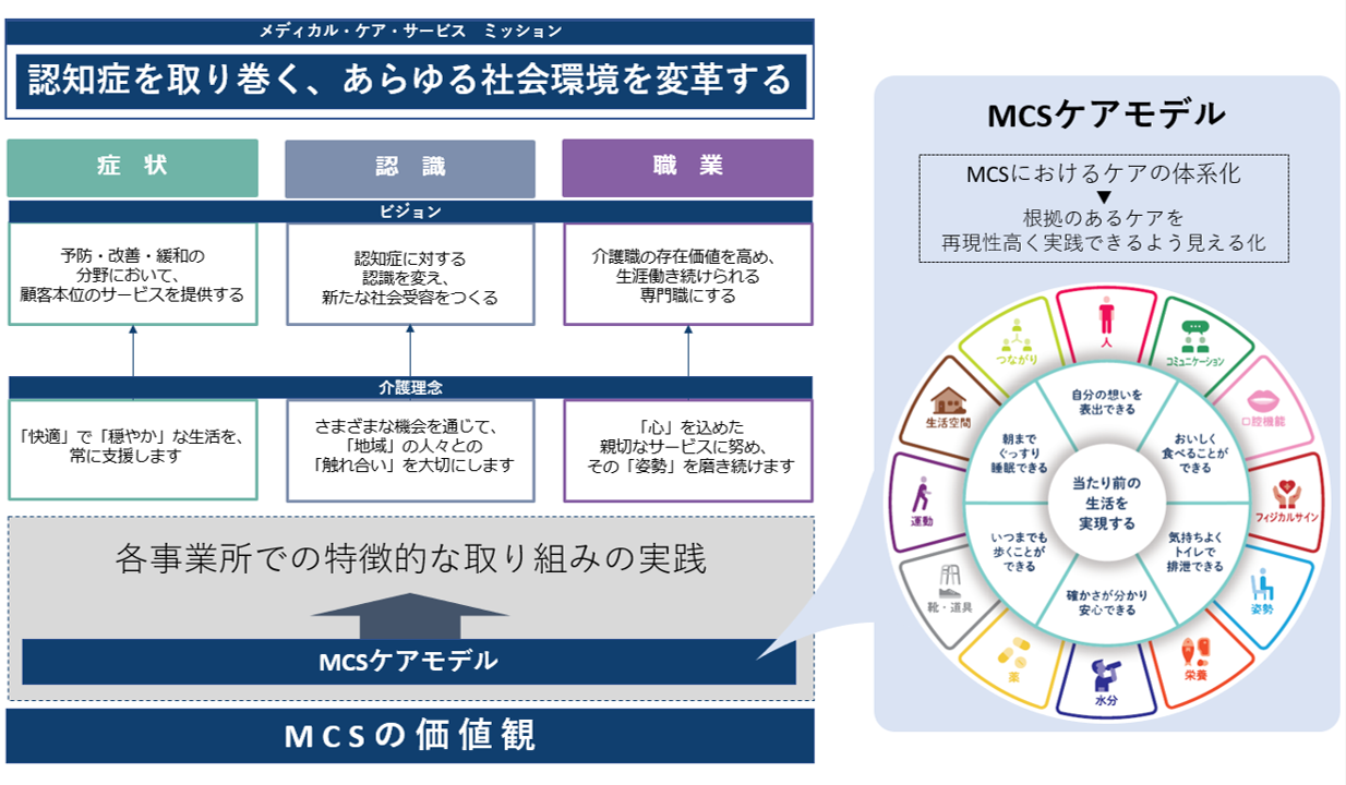 これまで蓄積してきた各事業所での特徴的な取り組みを生かしつつ、「MCSケアモデル」をケアの基盤とし、介護スタッフ間でケアの目的や考え方に対する共通認識を持つことで、当社のミッション「認知症を取り巻く、あらゆる社会環境を変革する」やビジョンの実現に向けて取り組んでまいります。