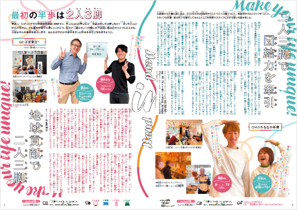 特に、当社の主力事業である認知症ケアや介護は、チームで目的を持って実現していくことが、チーム力やケアの品質の向上につながっていきます。そのため、仲間と支え合いながら中期経営計画を体現している介護スタッフの取り組みや、人生の大先輩であるご利用者が年齢を重ねても、介護スタッフのサポートを経て挑戦し続ける姿を特集しました。